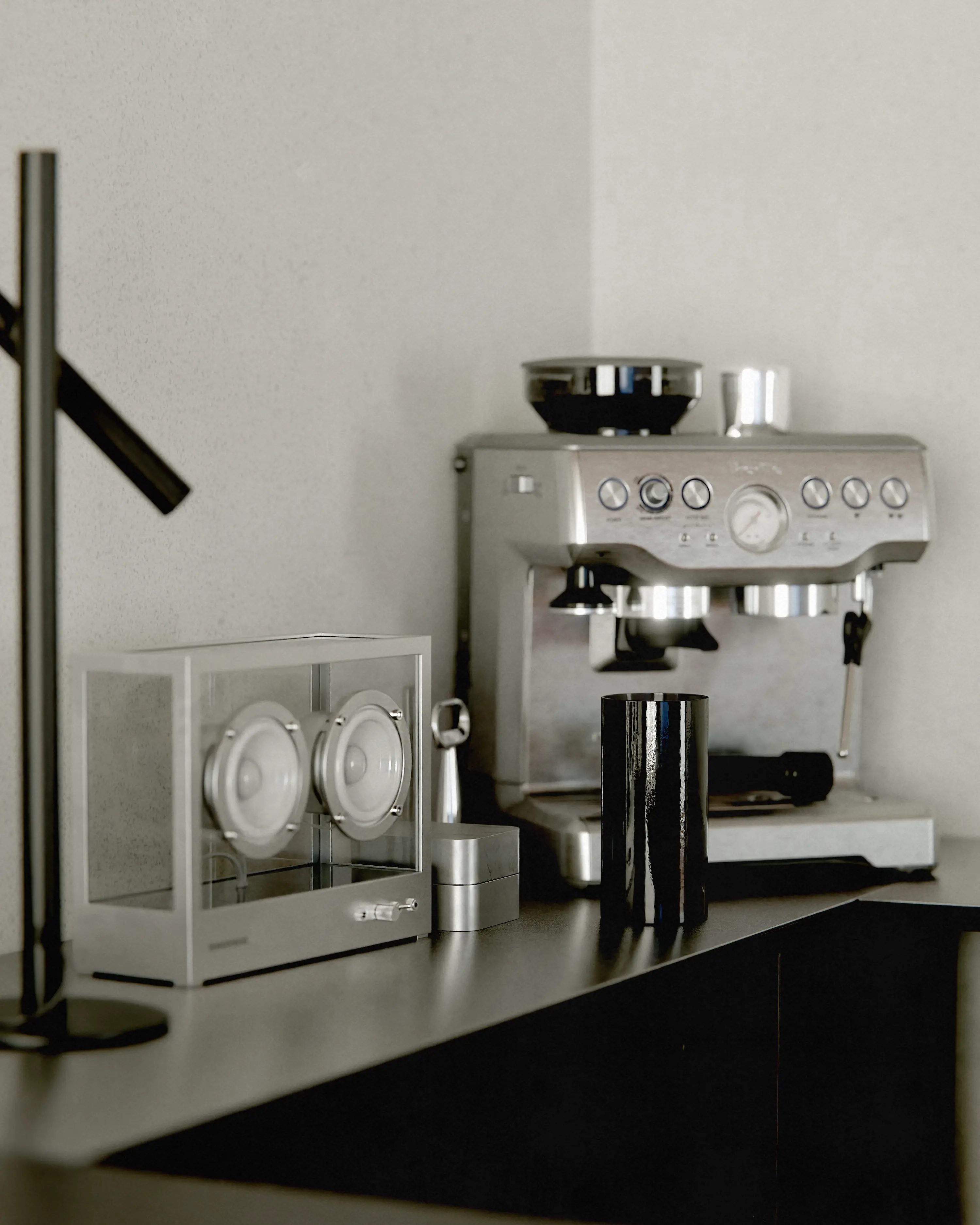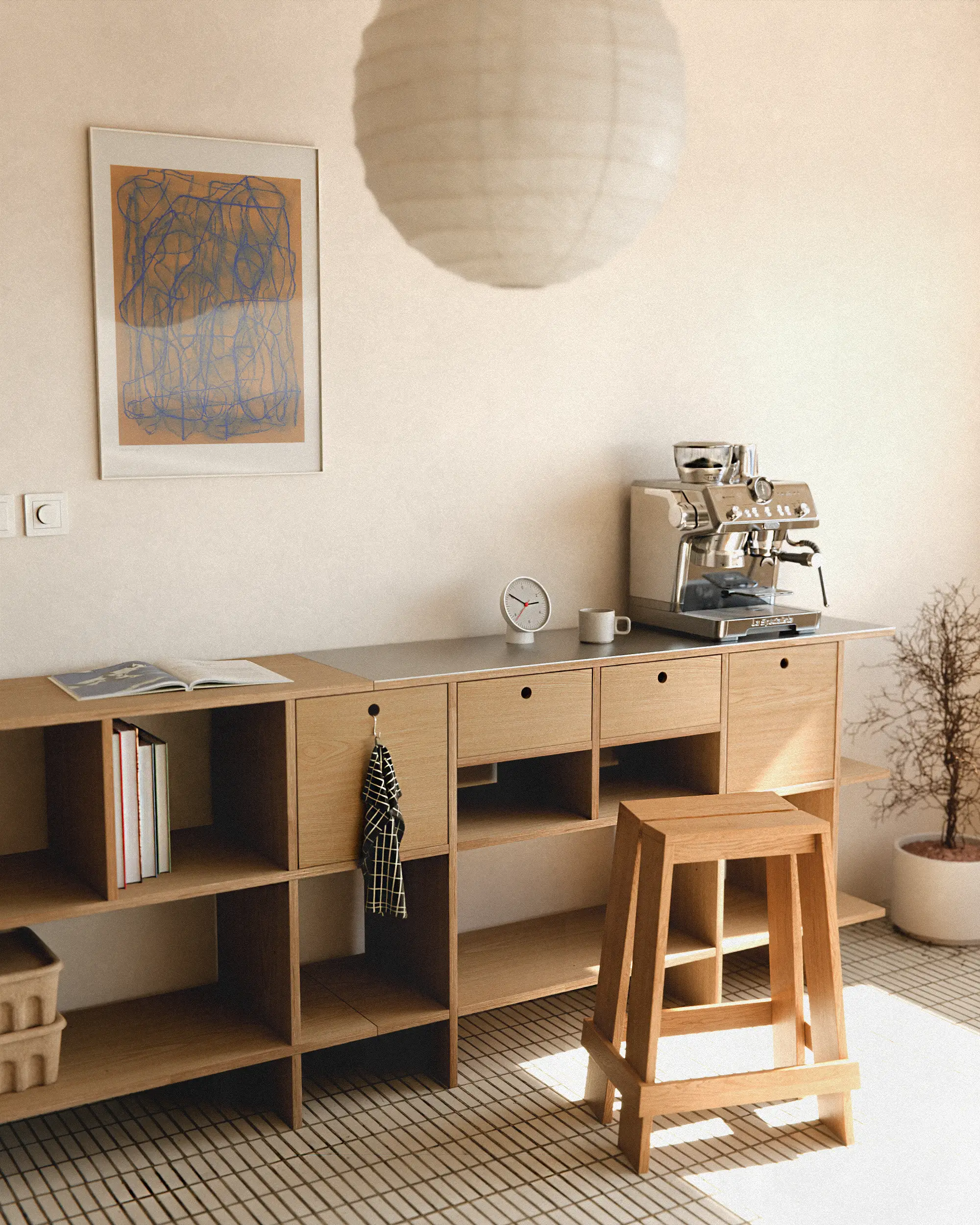 에센셜 박스를 활용해 다양한 도구를 깔끔하게 수납할 수 있으며, 스테인리스 탑을 더하면 더욱 쾌적하고 기능적인 사용이 가능합니다. 커피를 준비하거나 가볍게 즐기는 순간까지, 하나의 작은 홈 바처럼 공간을 완성합니다.