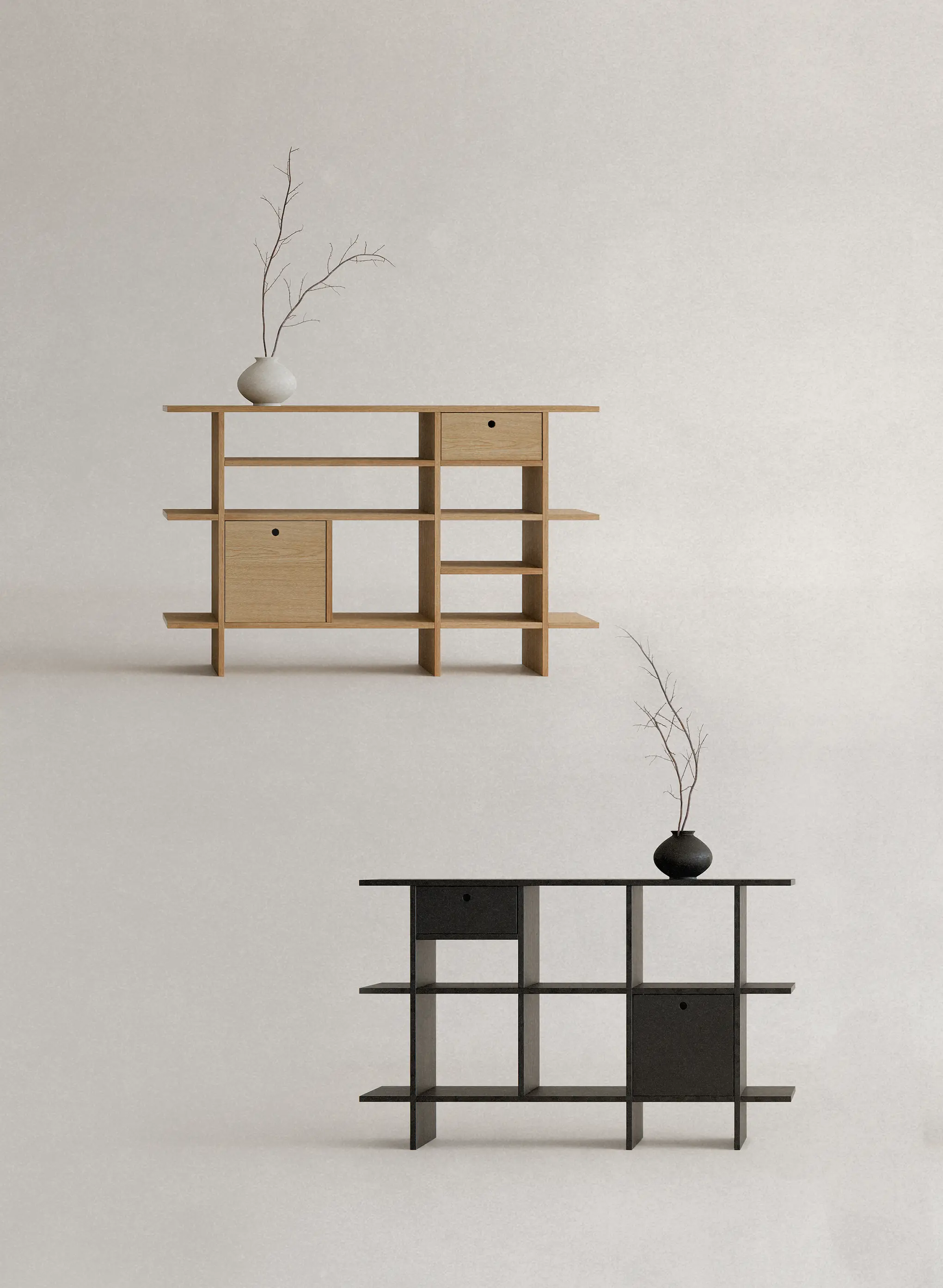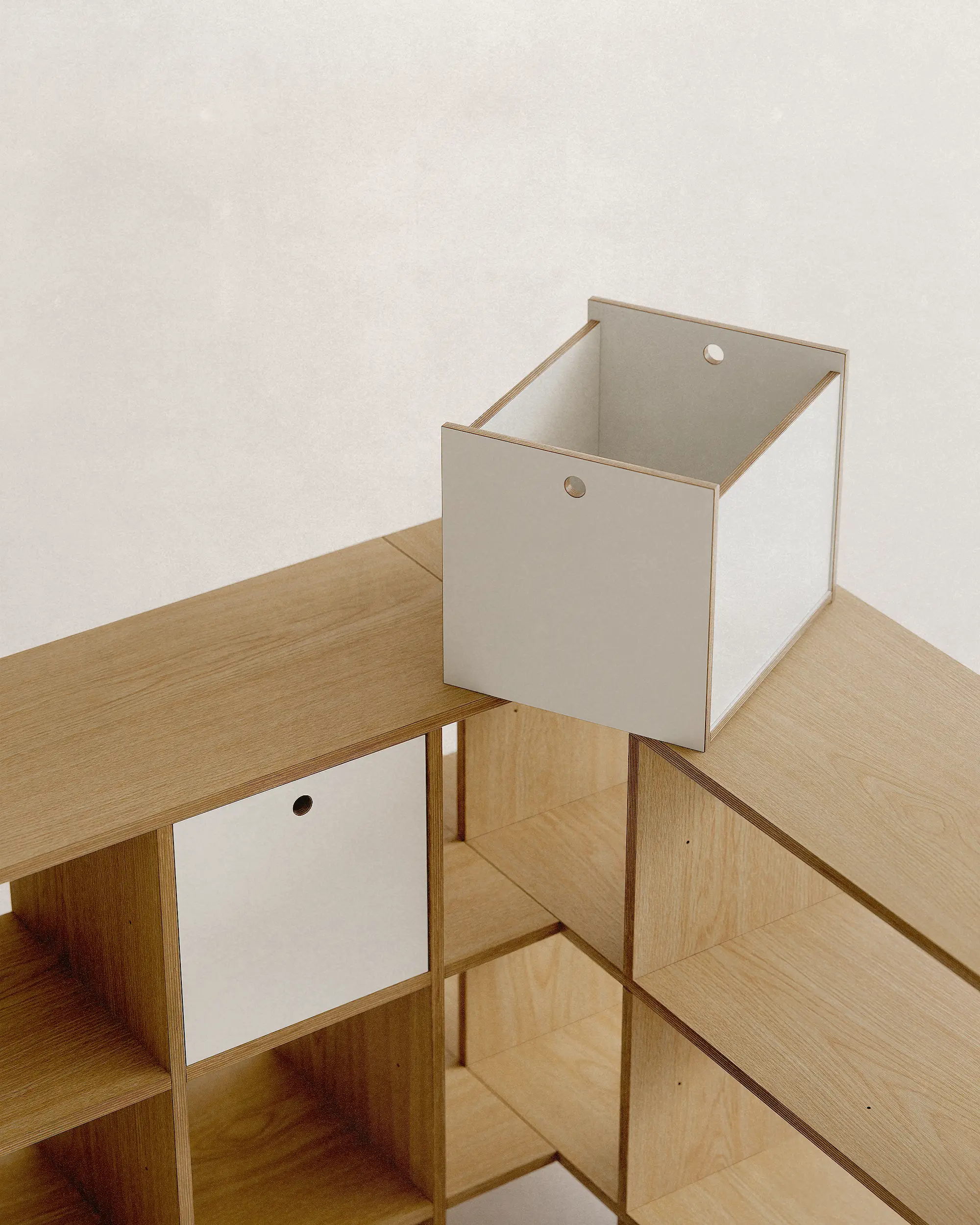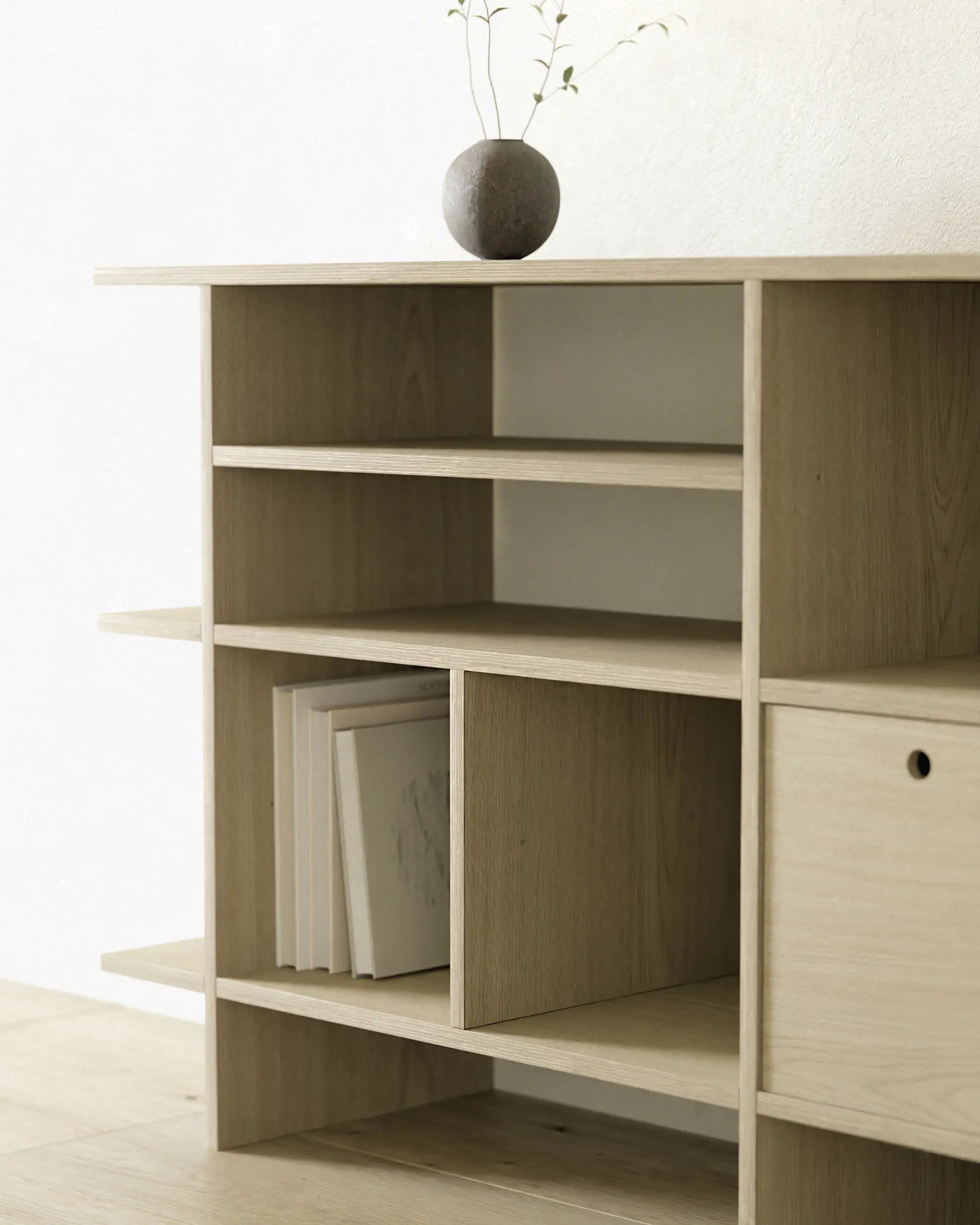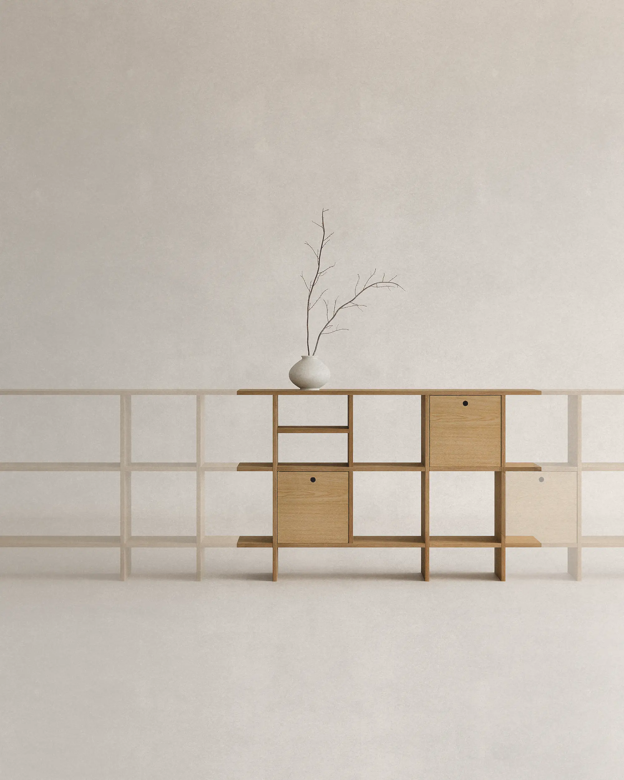 불필요한 요소를 과감히 덜어내고, 선과 칸의 비율과 사용성에 집중했습니다. 에센셜 쉘프는 사용자에 맞춰 유연하게 확장되는 미니멀한 구조로, 시간이 지나도 변함없이 함께하는 가구입니다.