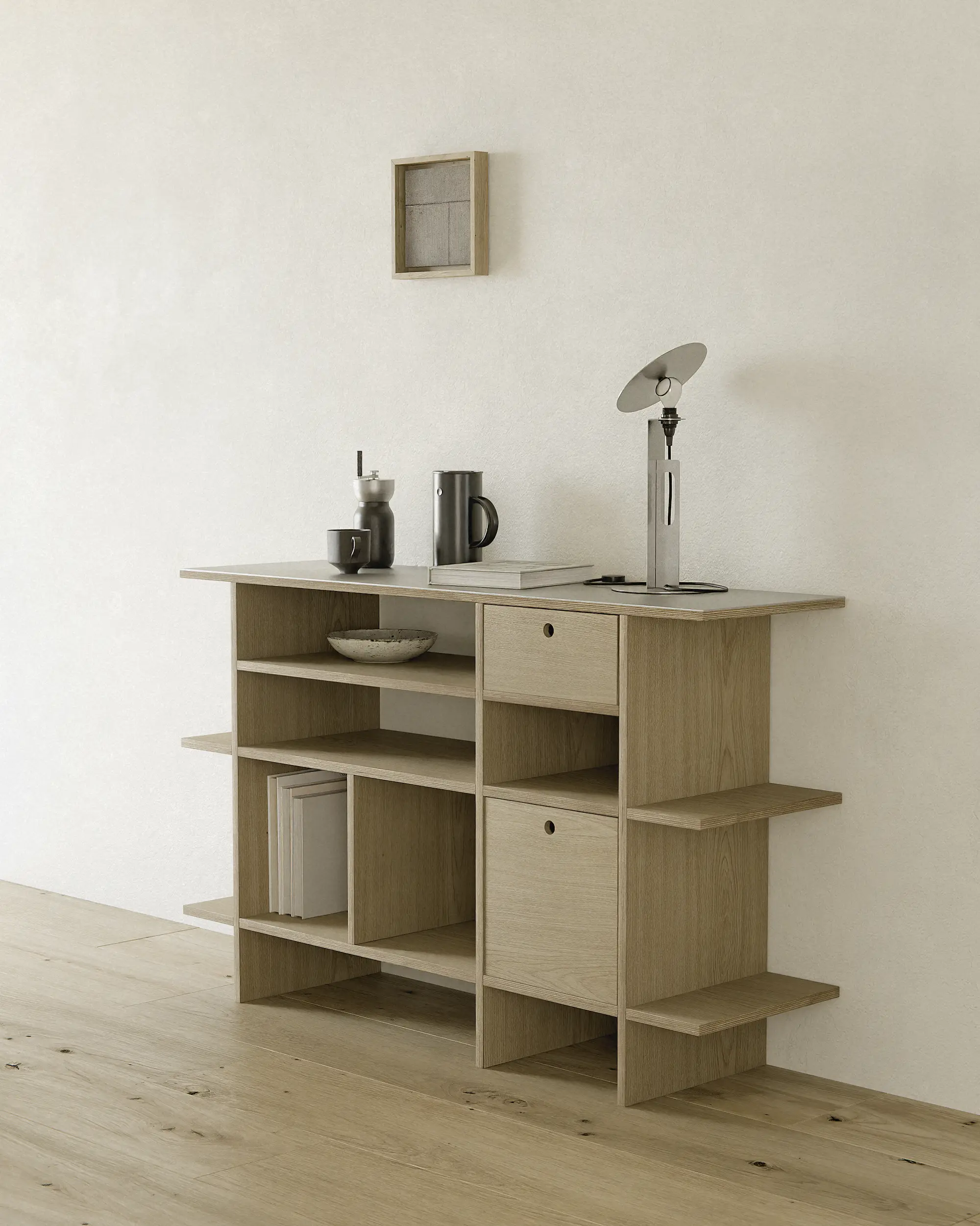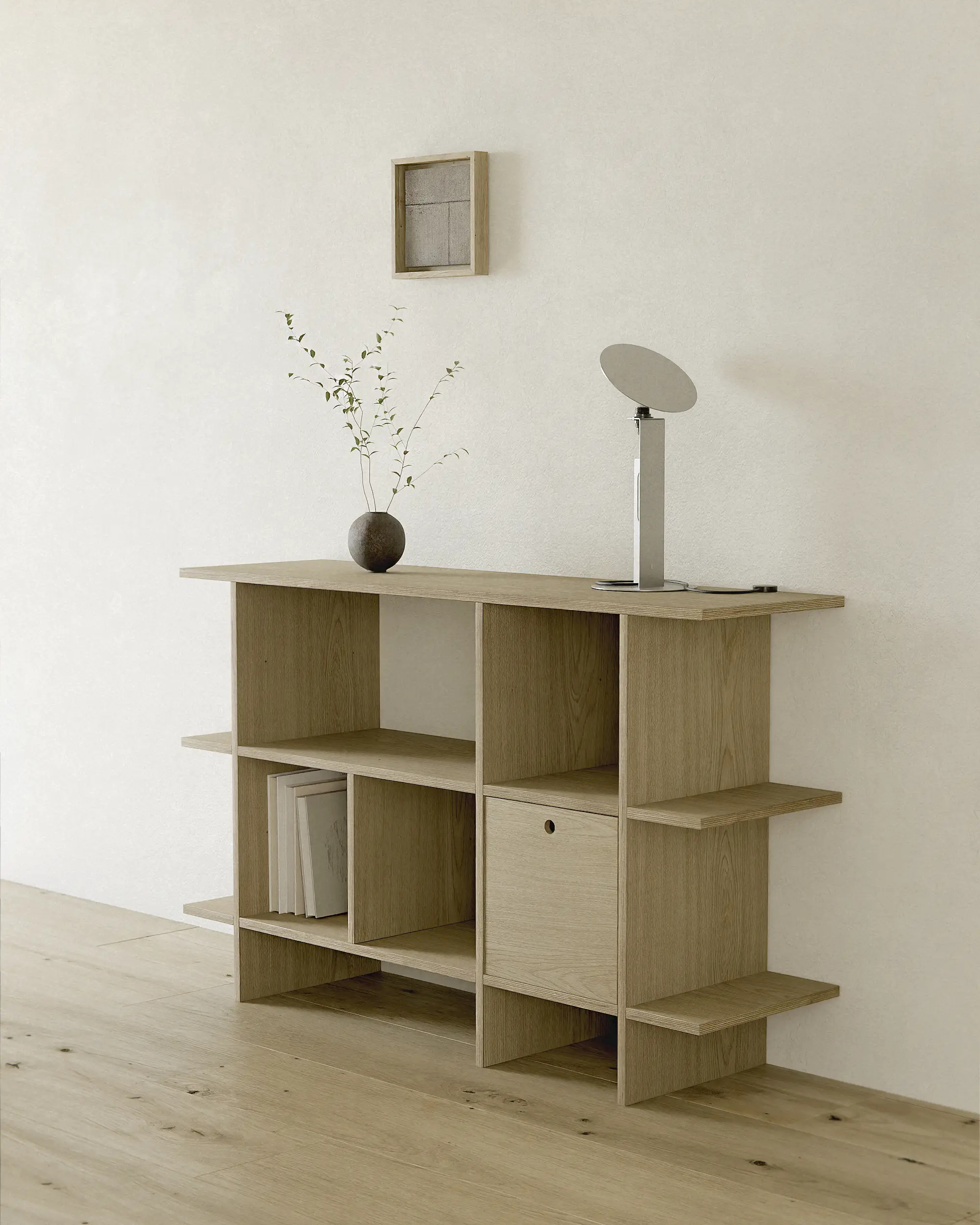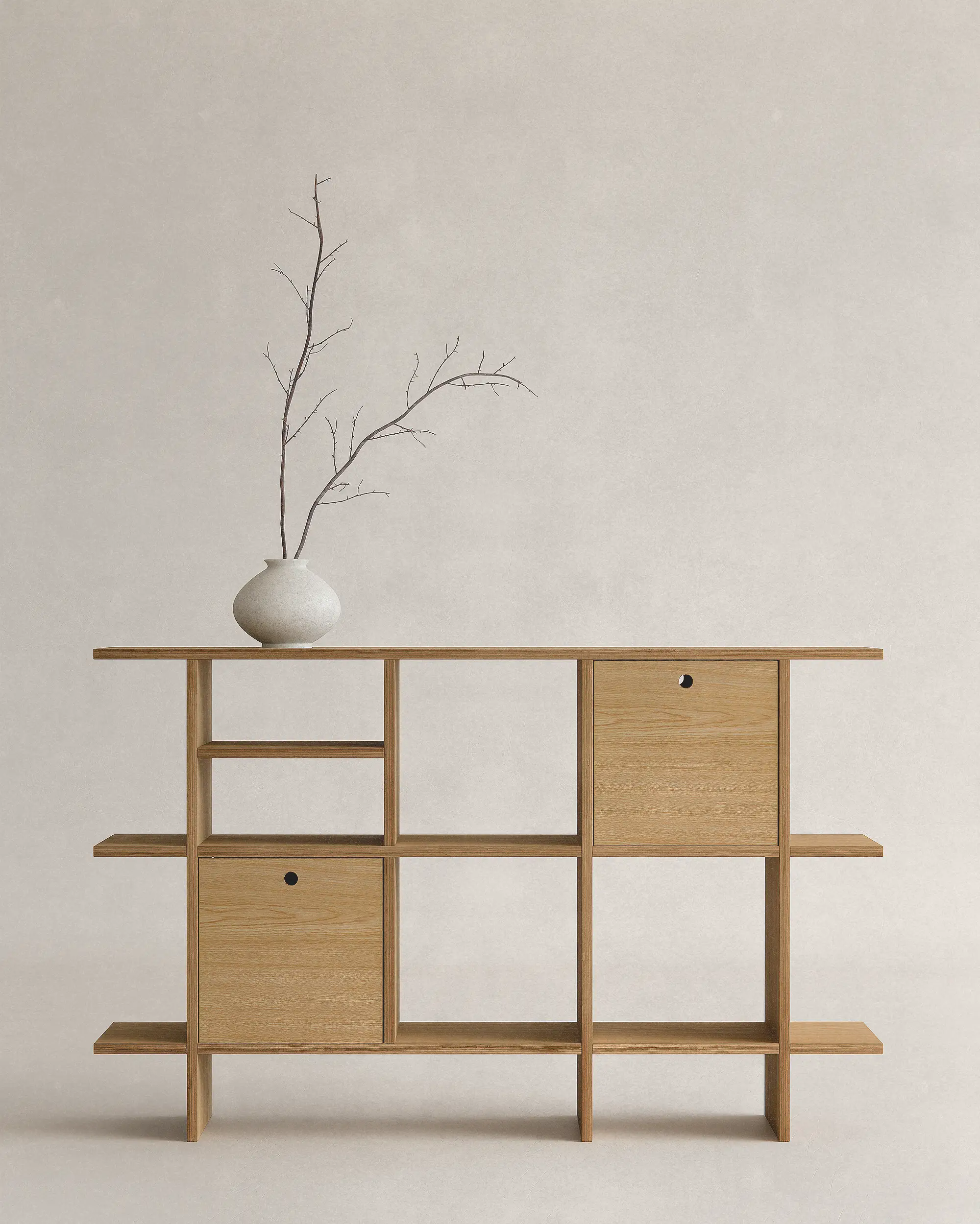 에센셜 쉘프는 공예적 가치와 현대 소재의 실용성을 조화롭게 담고 있습니다. 오크 텍스처 라미네이트는 천연 오크의 질감을 살리면서도 관리의 부담을 줄여주며, 자작나무 합판은 뛰어난 내구성과 안정성을 제공합니다. 마감은 천연 왁스 오일로 핸드 피니쉬되어 나무의 깊이와 결을 보존하고, 시간이 지날수록 자연스럽고 고급스러운 변화를 만들어냅니다.