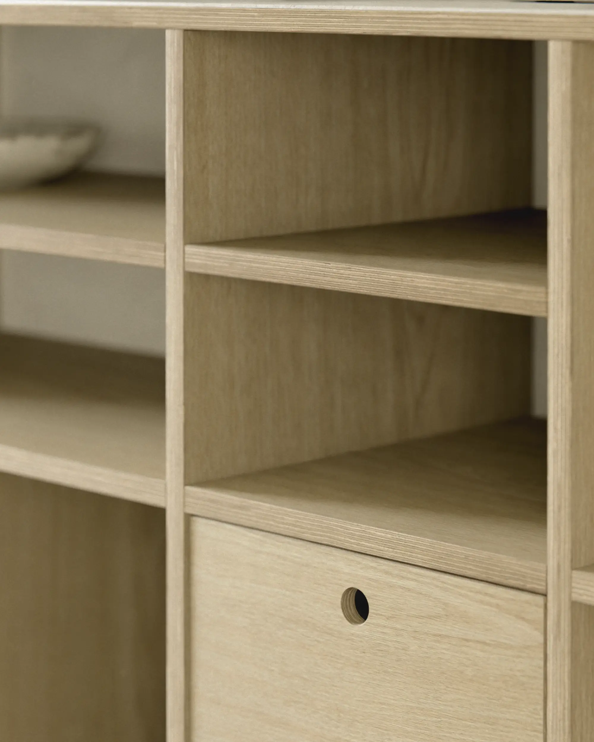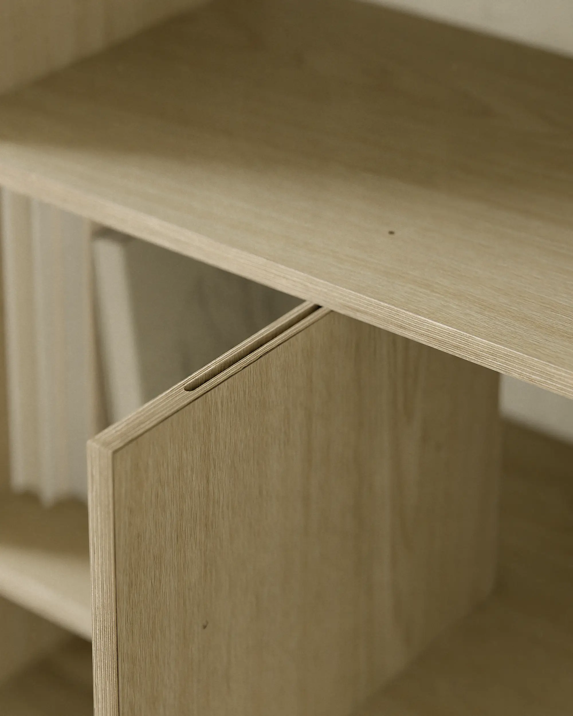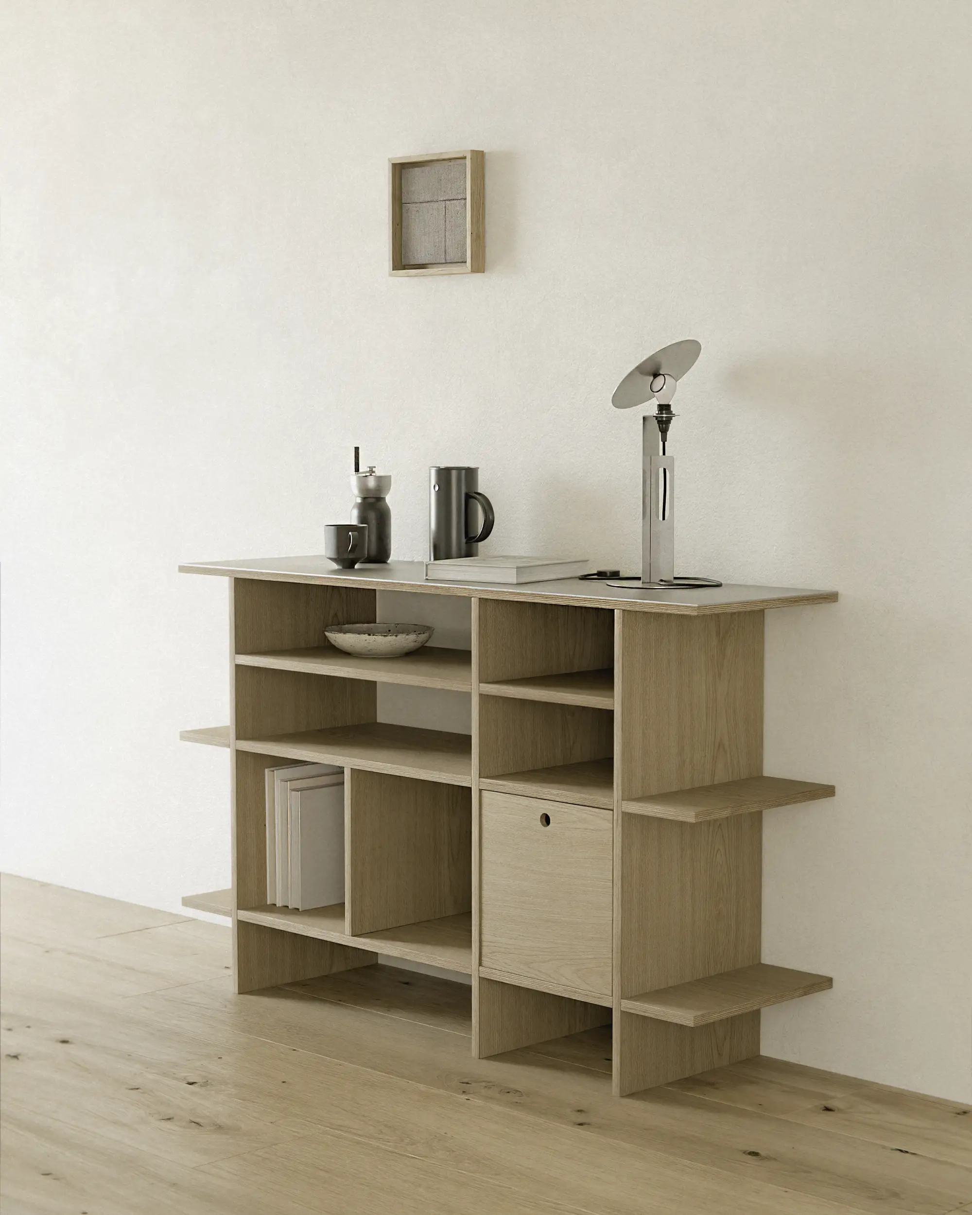 에센셜 쉘프는 공예적 가치와 현대 소재의 실용성을 조화롭게 담고 있습니다. 오크 텍스처 라미네이트는 천연 오크의 질감을 살리면서도 관리의 부담을 줄여주며, 자작나무 합판은 뛰어난 내구성과 안정성을 제공합니다. 마감은 천연 왁스 오일로 핸드 피니쉬되어 나무의 깊이와 결을 보존하고, 시간이 지날수록 자연스럽고 고급스러운 변화를 만들어냅니다.